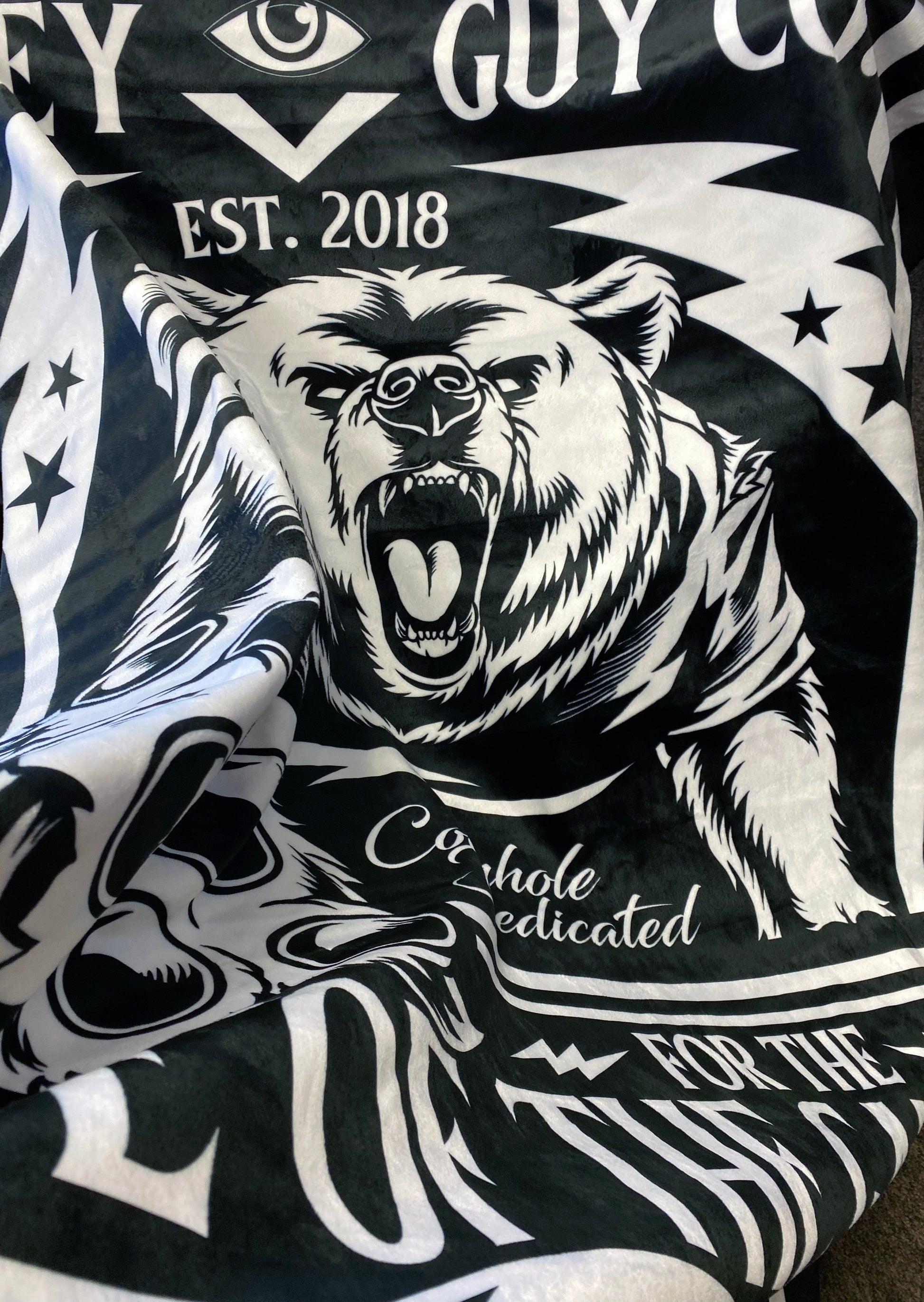 This blanket comes in a light cream Sherpa backing and the top is Jersey Guy Co. printed polyester. Super warm and comes in a 3 sizes.
