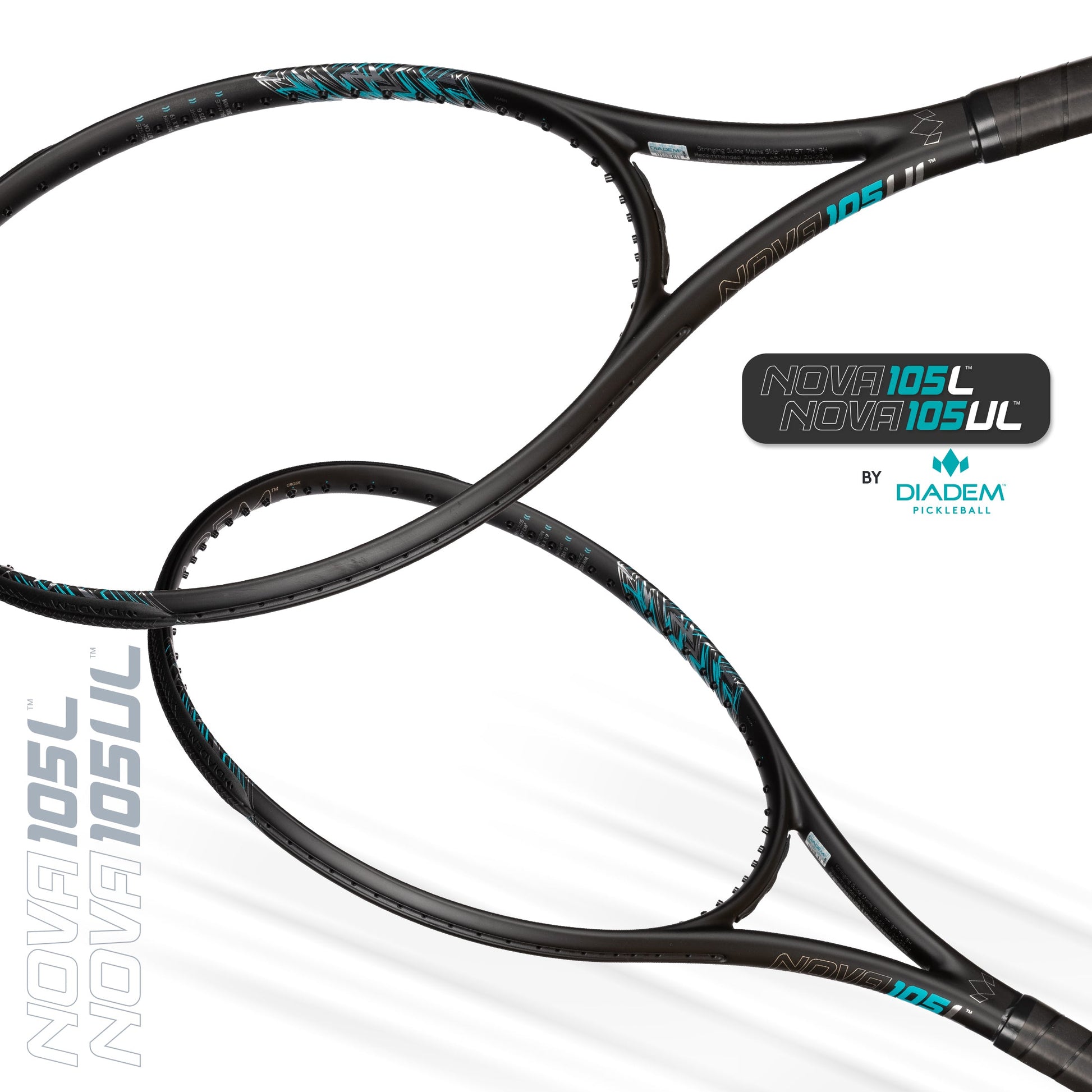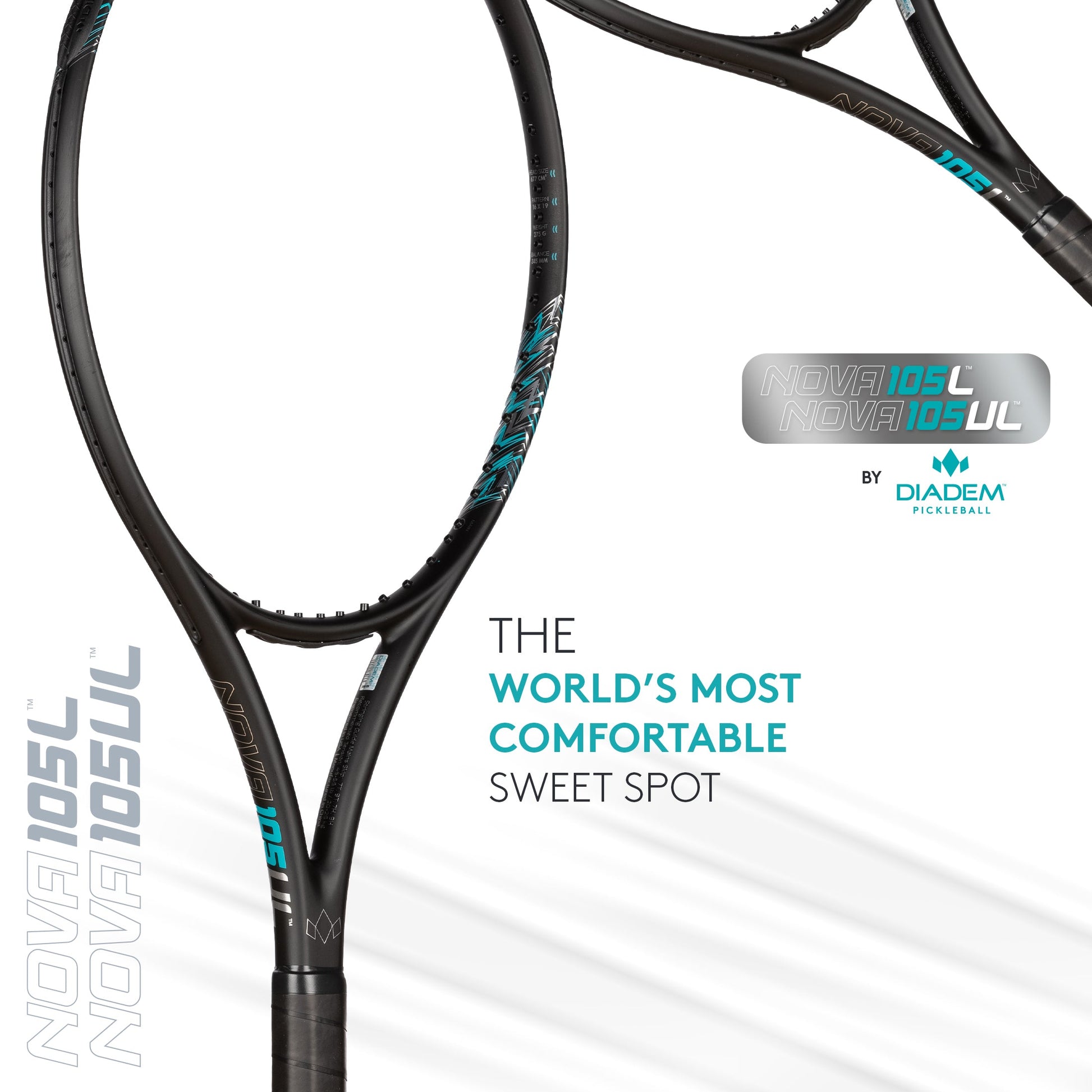 The Diadem Nova 105 Lite and Ultra Lite rackets are Diadem's first over size frames. After years of experimenting we have created the ultimate combination of a high end with function. These user-friendly and extremely forgiving 105 square inch head combines excellent stability and created the World's most comfortable sweet spot.