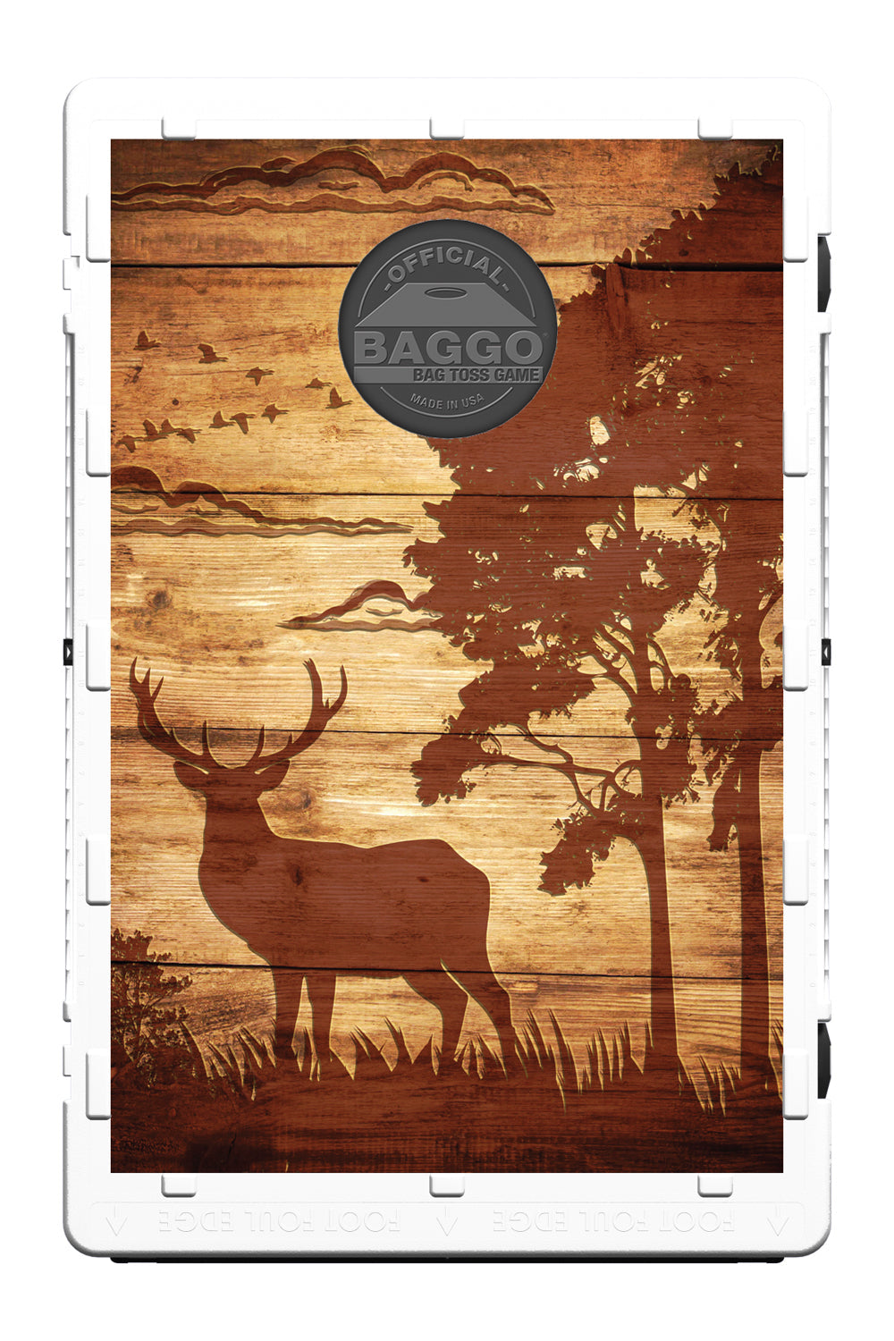 BAGGO comes complete with: Two official BAGGO game boards with life-time guarantee, eight official bean bags, 12 page color instruction manual with Warranty Card included, a wall mounting bracket for storage & display, built-in scorekeepers, and distance regulator. The graphics for the game are reverse printed digitally on a sheet of PVC that is installed into the face of the game & ready for action. The official BAGGO bean bags are constructed of a heavy duty Poplin blend of 65% polyester and 35% cotton with an all-purpose, dual duty, extra-strength thread, bags are filled with 9.5oz of treated unpopped corn (a digestible particulate).