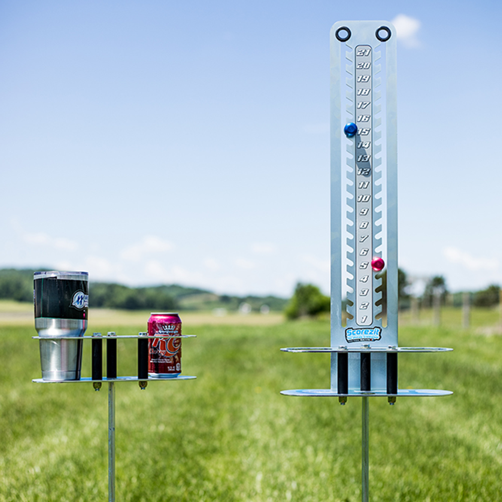 If you play cornhole, one side would have a Scorezit™ to keep score and hold beverages, while the other side would have a Drinkit™ to hold beverages for your teammate and competitor. It is made in the USA and built to last a lifetime. The Scorezit™ Cornhole Scorekeeper Set comes standard with two scoring knobs, two spots for holding drinks, a dual cell phone holder slot, a bottle opener, and a hard surface base. If you want to use the Scorezit™ and Drinkit™ on soft surfaces such as sand, we recommend our soft surface spike (sold separately).